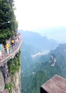 7日早上,我們來到了此行第一站——天門山。天門山海拔1500多米,因自然奇觀天門洞而蜚聲世界,被譽(yù)為“湘西第一神山”和“武陵之魂”。我們乘著觀光大巴沿著逶迤曲折的公路盤旋而上,只見壁立千仞,懸崖萬(wàn)丈,每逢轉(zhuǎn)彎,車內(nèi)一片驚呼,盡顯刺激與緊張。下車后,我們繼續(xù)前行,當(dāng)大家爬過999層階梯最終到達(dá)巨大的天門洞前時(shí),不禁感嘆大自然的鬼斧神工,神秘玄奇。往下眺望,林木蒼翠,山腳下的湖波像綠寶石一樣鑲嵌其中,美不勝收。清風(fēng)徐來,令人神清氣爽,視野開闊,豪氣頓生。天門山上的玻璃棧道,依峭壁凌空而建,讓人望而生畏,行而卻步。大家都小心翼翼,體驗(yàn)雙腳處于萬(wàn)丈深谷之上的驚險(xiǎn)。
