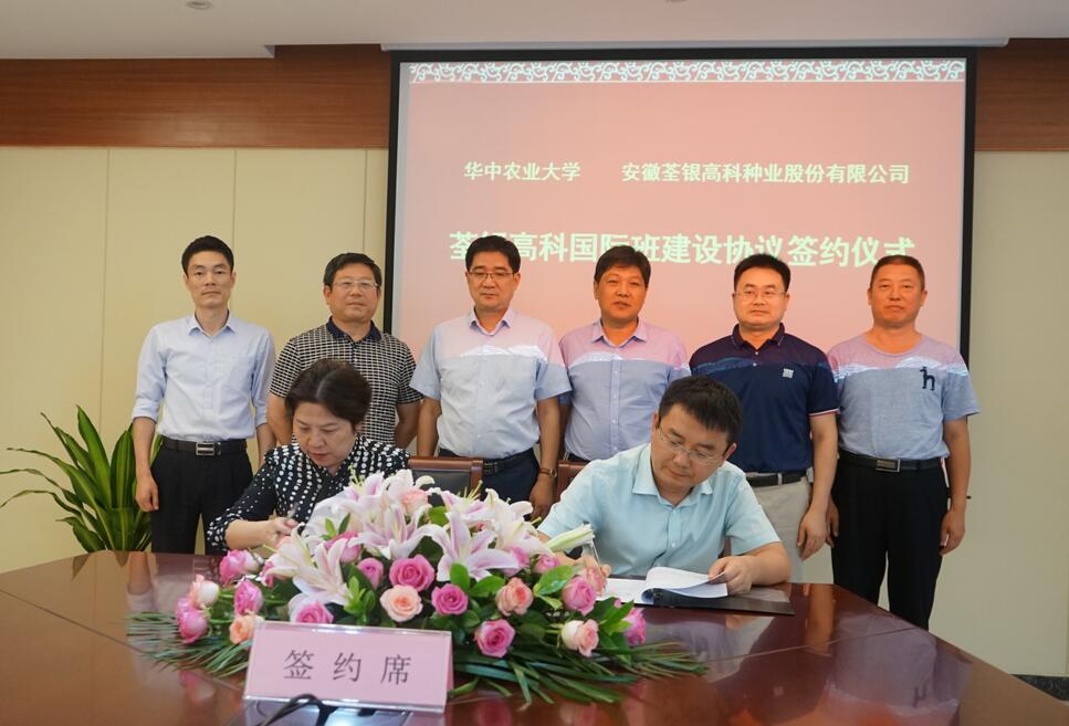 ??? 2019年8月12日,華中農(nóng)業(yè)大學(xué)校黨委常委、組織部長李向東,植物科學(xué)技術(shù)學(xué)院黨委書記周雄,植物科學(xué)技術(shù)學(xué)院院長嚴(yán)建兵一行蒞臨荃銀高科,雙方簽署荃銀高科國際合作班建設(shè)協(xié)議并座談交流,荃銀高科副董事長、總經(jīng)理張琴,副總經(jīng)理、首席技術(shù)官、荃銀農(nóng)科院院長張從合,副總經(jīng)理朱全貴等領(lǐng)導(dǎo)熱情接待了李向東常委一行。